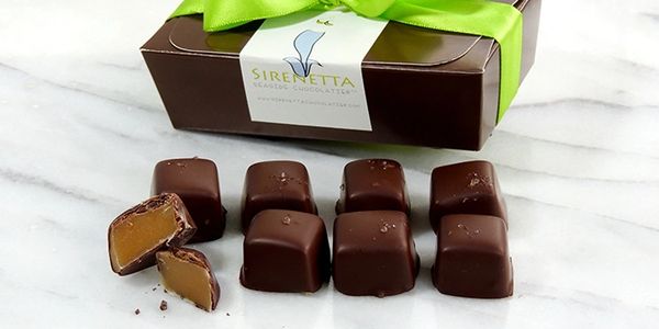 Twice as good as the four-piece box. A mix of creamy caramel blended with sea salt, dipped in 64% dark chocolate. finished with a pinch of locally harvested sea salt