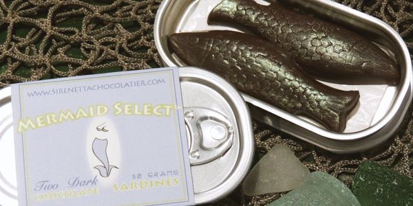 Two solid 64% dark chocolate molded fish with a shimmering finish packed snugly together in their own sweet little snack tin